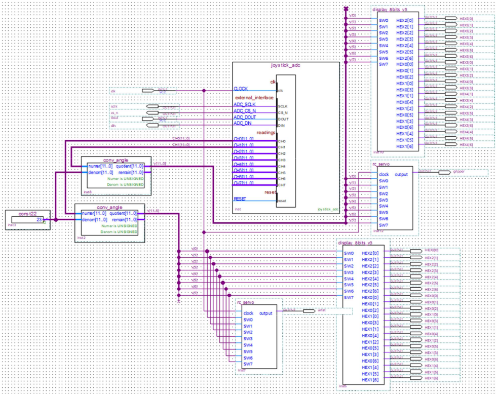 This was the final project for EECE2160 Embedded Design. The goal was to program an Intel DE1-SoC FPGA using Intel Quartus and C++ to enable a robotic arm to move. To start, the FPGA was programmed in Intel Quartus to be able to rotate 3 types of motors: a DC brush motor, a stepper motor, and a RC servo. Before programming, various circuits were made using logic gates and a Moore Machine. The FPGA was then programmed in Intel Quartus and the motor wired. Once verified to be working, the FPGA was reset to be coded in C++. The code can be found on this GitHub repository. Once the code was verified to be working, the functionality was expanded to include the input of a joystick to control the motors. Then it was used to control the robot arm. Lab reports are avaliable upon request.